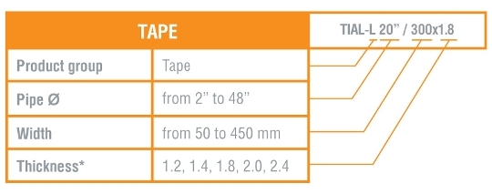 Recommended dimensions of TIAL-L tape and consumption of the product depending on pipe diameter are listed in Table 3. If different diameters are used please contact TIAL to obtain specific figures. Dimensions of the tape can be changed according to customer request.